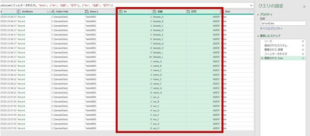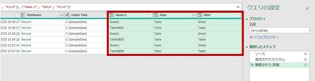 9. ファイルの中に含まれているシートやテーブルといったオブジェクトの種類 ([Kind]) を表示する列などが追加されます。 [Name.1] は名前を確認するため、[Data] はあとでデータが格納されているテーブルの内容を展開するため、[Kind] はこのあとテーブル オブジェクトだけを抽出するために追加 (展開) しています。