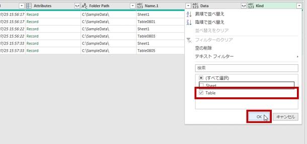 10. [Kind] 列のフィルター ボタンをクリックして [Table] のみチェックをオンにして [OK] をクリックします。