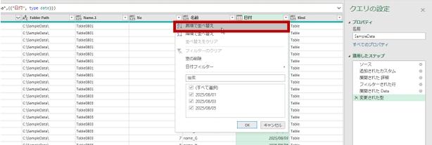 15. (必要なら) ワークシートに読み込むときにデータの順序を指定したい場合は並べ替えを実行します。 ここでは [日付] 列の昇順にしています。