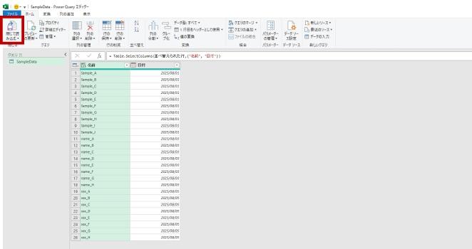 16. 不要な列は削除します。 ここでは、テーブルの [名前] 列と [日付] 列以外は削除しています。