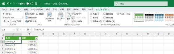 19. データを読み込んだ Excel ブックで、テーブルを選択して、リボンの [テーブル デザイン] タブの [外部のテーブル データ] グループの [更新] をクリックします。