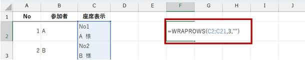 ここでは、セル C2 から C21 を 3 列で折り返す表を作りたいので、「=WRAPROWS(C2:C21,3,"")」としています。