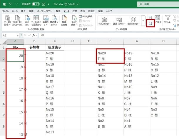 3. [No] 列で [降順] の並べ替えを実行すると、元データの順番が変わり、WRAPROWS 関数の数式で作成した結果の順序も変わります。(左上に No 20 の T がきます)