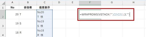 やり方は 1 つではないけれど、ここでは、WRAPROWS 関数の数式の第 1 引数に、VSTACK 関数を使って、1 つの空白と C2 から C21 を結合した配列を指定します。数式は「=WRAPROWS(VSTACK("",C2:C21),3,"")」です。 先頭に 1 つ空白セルを存在させたいための処理です。