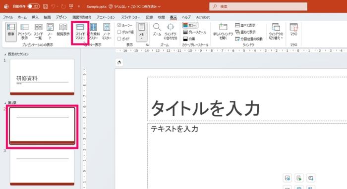 1. ヘッダーを設定したいスライドを選択し、リボンの [表示] タブの [マスター表示] グループの [スライド マスター] をクリックします。