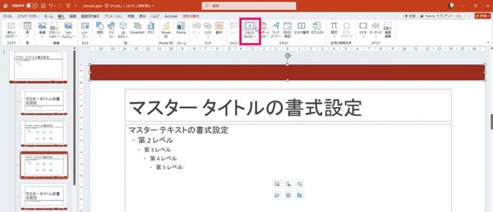 5. リボンの [挿入] タブの [テキスト グループ] の [テキスト ボックス] をクリックします。