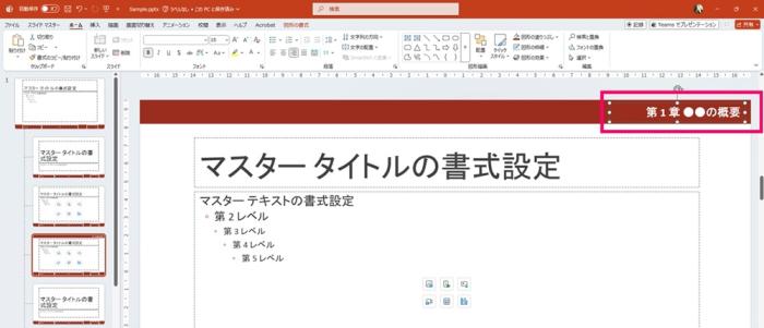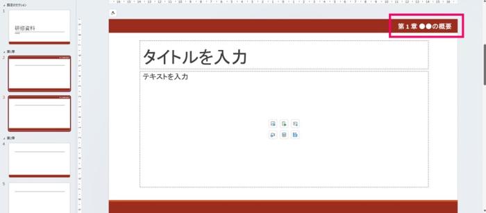 スライドが何十枚もあるときに、右上の文字列をちくちく修正するのは大変な作業です。 共通して表示できる内容はスライド マスターのレイアウトに含めておくと、一括変更もできるし、スライドを追加するだけで表示されるのでデザインを保ちつつ効率よく適切な文字列を表示できます。