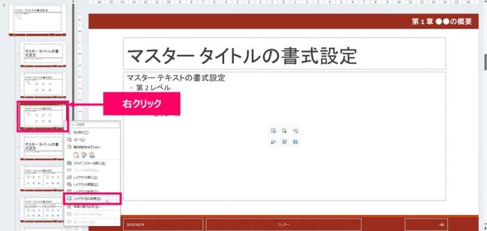 1. まずは、第 1 章のスライドに作成したレイアウトを適用したいので、スライド (第1章のスライド) を選択して右クリックし、[レイアウト] で適用したいレイアウト (ここでは [第1章 ヘッダーあり] ) をクリックします。