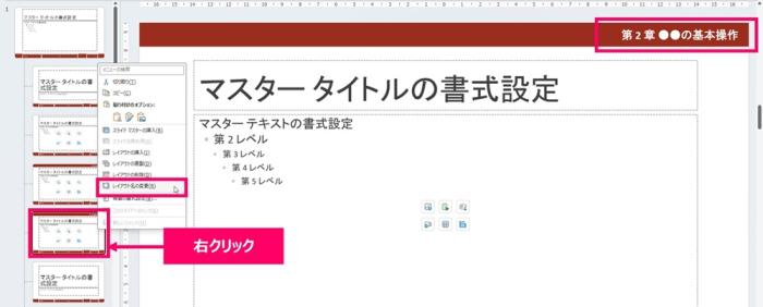 適用したいスライド (第 2 章のスライド) を選択して右クリックし、[レイアウト] で適用したいレイアウト (ここでは [第 2 章 ヘッダーあり] ) をクリックします。