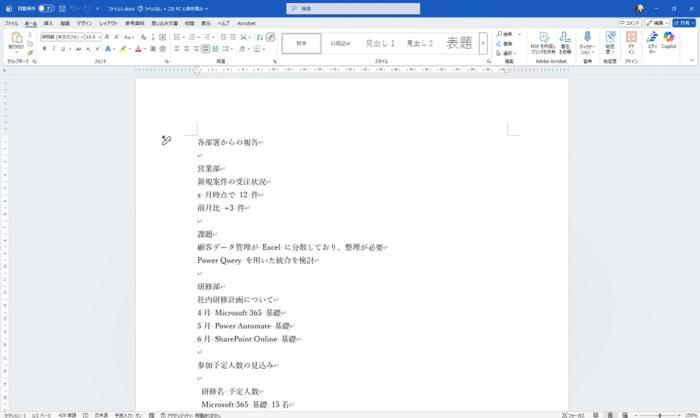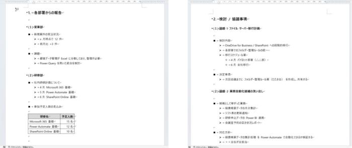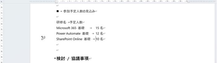 1. まずは書式のことは気にせずに、Word の新規文書に内容の区切りに改行 ([Enter] キーを押す) をいれてベタ打ちしておきます。なんならこのくらいなら会議でお話しながらでもかけるかもしれません。