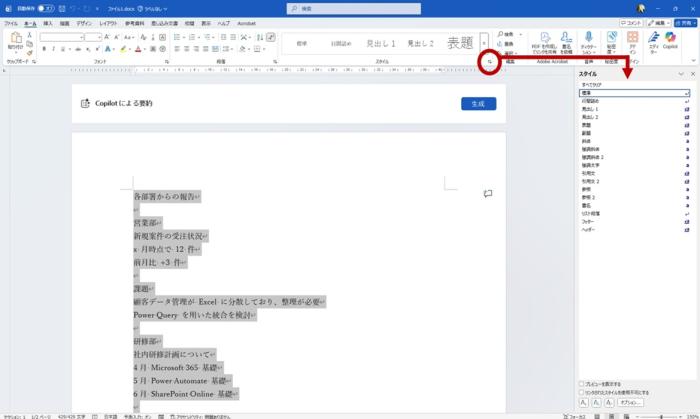 2. 文書全体が選択されたら、リボンの [ホーム] タブの [スタイル] グループの右下にある小さい矢印をクリックして、[スタイル] ウィンドウを表示しておきます。