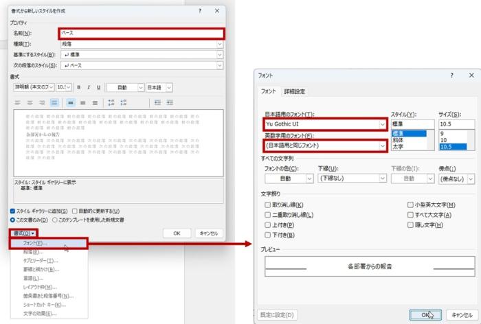 4. [書式から新しいスタイルを作成] ダイアログ ボックスで、任意の名前 (ここでは「ベース」) を入力・設定して、文書全体で使いたいフォントの種類やサイズなどを設定します。