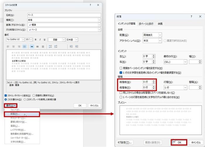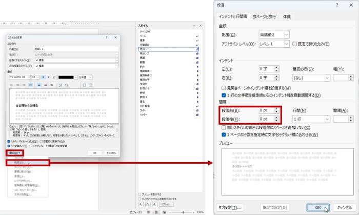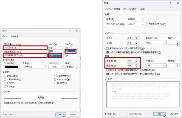 9. [フォント] ダイアログ ボックスでフォントの種類やサイズ、[段落] ダイアログ ボックスで [段落前] や [段落後] の隙間などの書式を変更します。