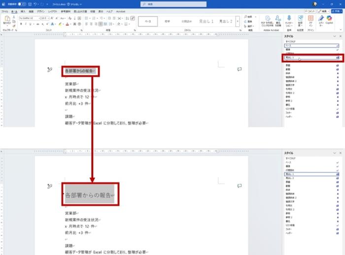 6. [見出し1] の書式が変更され、[見出し1] が設定されているすべての段落に変更が反映されます。