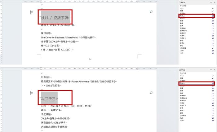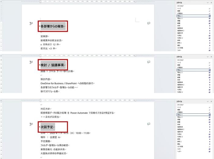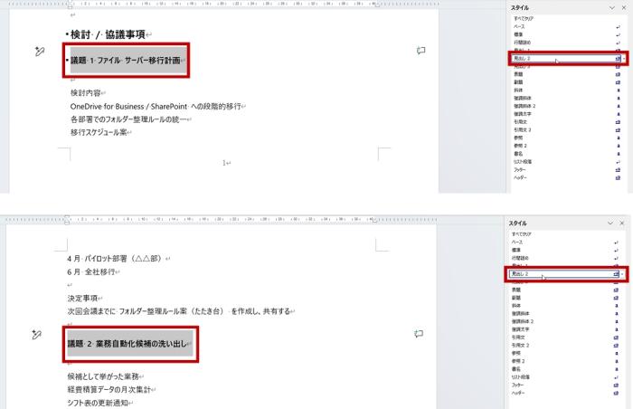 2. 文書内に同等レベル (一番上位) の見出しにしたい段落が複数あるのなら、そのすべてに [見出し1] を設定します。