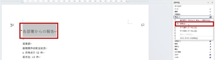 3. 既定の [見出し 1] の書式が気に入らない (フォントの種類が違う、フォントが大きすぎる、段落前後の隙間がありすぎるなどの) 場合は、すでに [見出し1] を設定している段落を選択して、[スタイル] ウィンドウの [見出し1] を右クリックして、 [変更] をクリックします。
