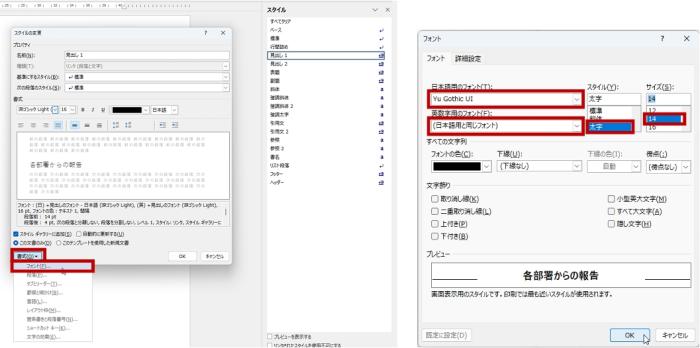 4. 最初にスタイルを作ったときと同じように、[書式] - [フォント] で [フォント] ダイアログ ボックスを表示し、フォントの種類やサイズ、太字にするかどうかなどを設定します。