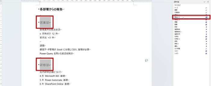 まだ見出しスタイルを設定していないけれど、「ここも見出し2 だな」という段落が後から見つかったら、その段落を選択して、[スタイル] ウィンドウで [見出し2] をクリックして設定すればよいです。