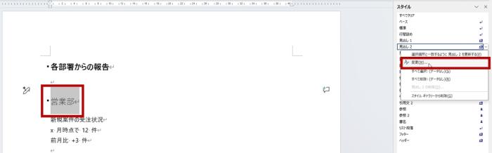 ([見出し2] が設定されているいずれかの段落を選択して、[スタイル] ウィンドウで [見出し2] を右クリック → [変更])