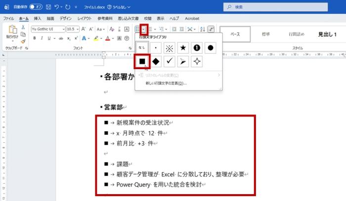 1. 箇条書きにしたい段落を選択して、リボンの [ホーム] タブの [段落] グループの [箇条書き] の下向きボタンをクリックし、一覧で行頭文字を選択します。