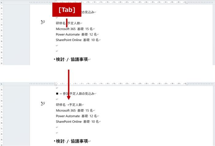 箇条書きよりも表のほうがわかりやすい内容がある場合は、表の枠組みを作ってから入力すると時間がかかるので、ベタ打ちしてある文字列にタブを挿入して区切り位置を決定し、表に変換するとはやいです。
