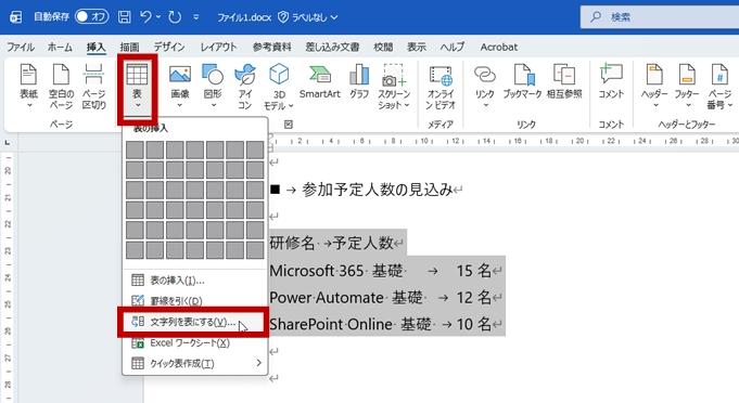 3. タブを挿入した、表に変換する段落を選択し、リボンの [挿入] タブの [表] をクリックし、[文字列を表にする] をクリックします。