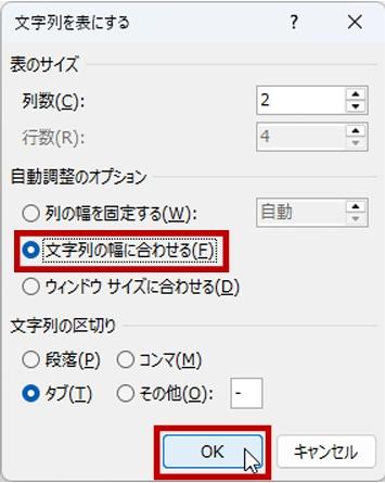 4. [文字列を表にする] ダイアログ ボックスで [文字列の幅に合わせる] を選択して [OK] をクリックします。