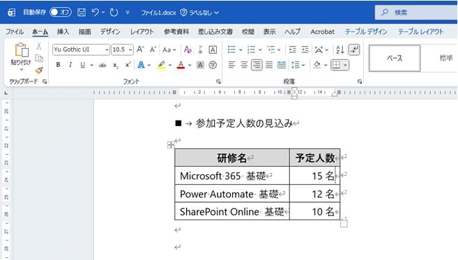 5. 表が作成されたら、文字列の配置や 1 行目を目立たせる書式を設定して整えればできあがり。