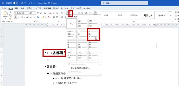 1. [見出し1] が設定されている段落を選択して、リボンの [ホーム] タブの [段落] グループの [段落番号] の下向きボタンをクリックして、設定する段落番号の種類をクリックします。