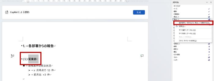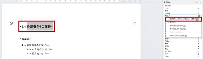 2. 段落番号を設定した見出しの段落を選択して、[スタイル] ウィンドウで [見出し 1] を右クリックし、[選択個所と一致するように見出し1 を更新する] をクリックします。