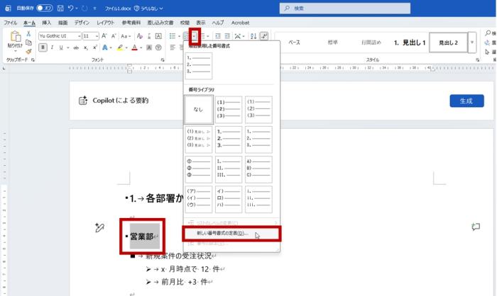 4. 設定したい段落番号の種類がない場合は、(ここでは [見出し2] が設定されている段落を選択して)、 リボンの [ホーム] タブの [段落] グループの [段落番号] の下向きボタンをクリックして、[新しい番号書式の定義] をクリックします。