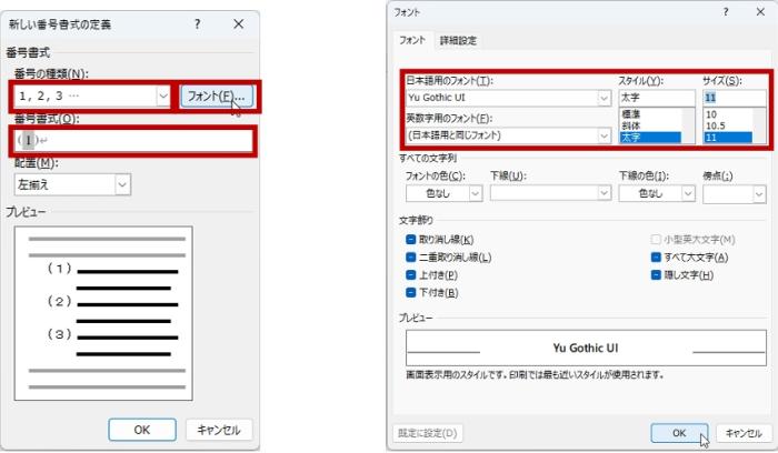 5. [新しい番号書式の定義] ダイアログ ボックスで、[番号の種類] を選択し、必要なら [番号書式] でかっこなどを付け加えて、[フォント] をクリックし、[フォント] ダイアログ ボックスで、選択している見出しと同じフォントの種類になるように設定します。(フォントの設定をしなくてもよいけれど、したほうがフォントのばらつきがなくなる。太字にしたり、サイズも合わせたりするとなおよい)