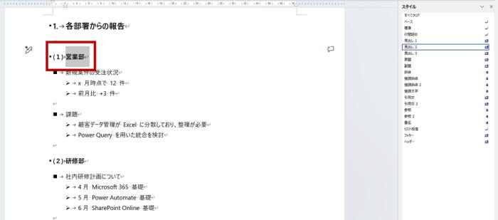1. 一番上位の見出しにしたい段落を選択して、[見出し1] をクリックします。