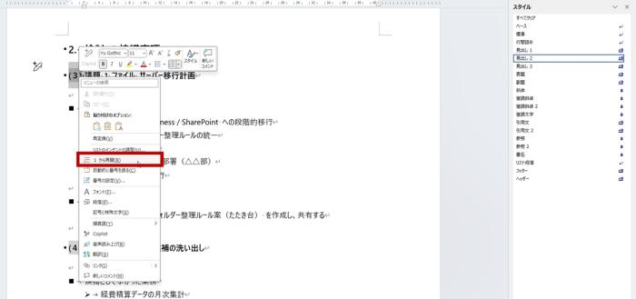 8. 番号を 1 から振り直したいところがあったら、その段落番号を右クリックして、[1 から再開] をクリックします。