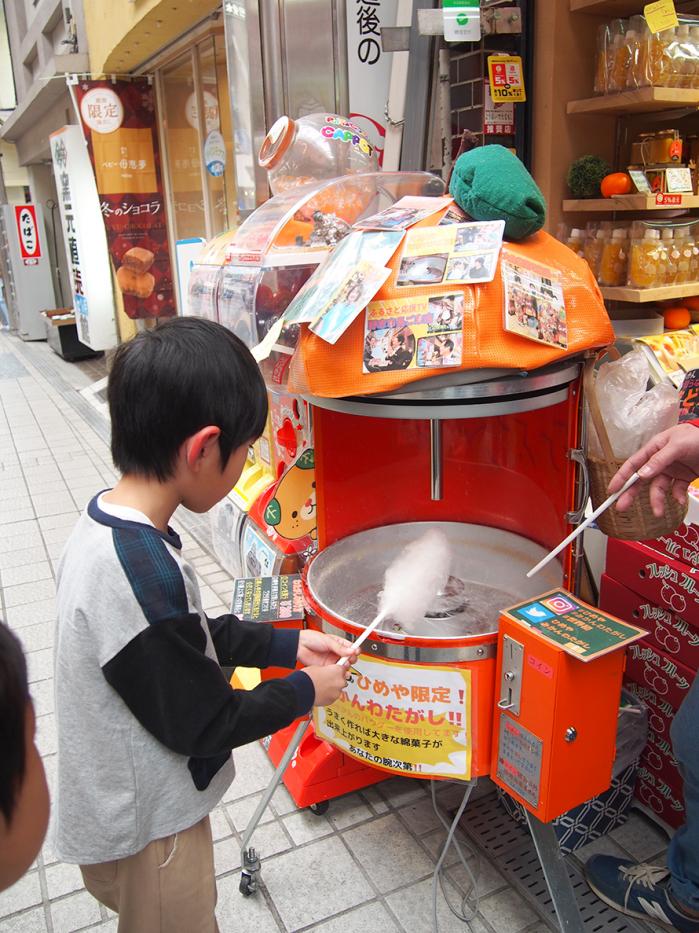 道後商店街には魅力的なお土産屋さん、飲食店もたくさん!中でも作って楽しいのが「ひめや」さんの世界初⁉とも言われるみかんわたがしです。1回200円で、お店の方にレクチャーしてもらい、自分でわたがしを作ることができます。