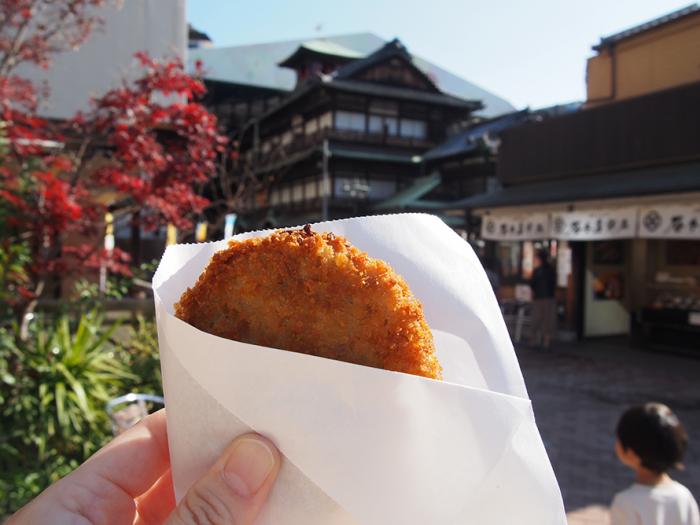道後温泉本館の目の前、2Fに上がるとかわいらしいカフェがあります。ここでは松山で定番の和菓子「一六タルト」の天ぷらが味わえます!食べ方は塩を少しかけて食べるのだそう。
