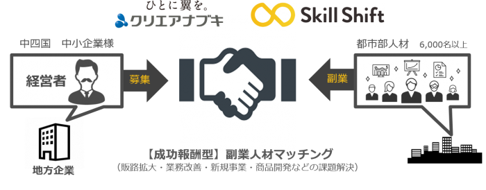 これは、中四国の中小企業に向けた成功報酬型の副業人材サービス事業で、これまで培ってきた人材紹介事業での経験や実績を活かし、中四国の企業が求める人材を、みらいワークスが運営するプラットフォーム「Skill Shift」を活用して募集し、両者をマッチングするものです。また、企業と副業人材の業務委託契約のサポートまでを一貫して対応し、副業人材の活用をスピーディに進めてまいります。