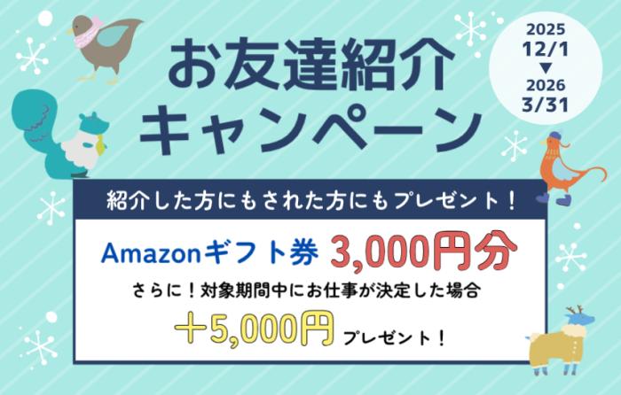 新しいお仕事をご希望されているお友達をご紹介いただき、お友達が登録を完了されると、ご紹介者様と登録されたお友達それぞれに、Amazonギフト券3,000円分をプレゼントいたします。