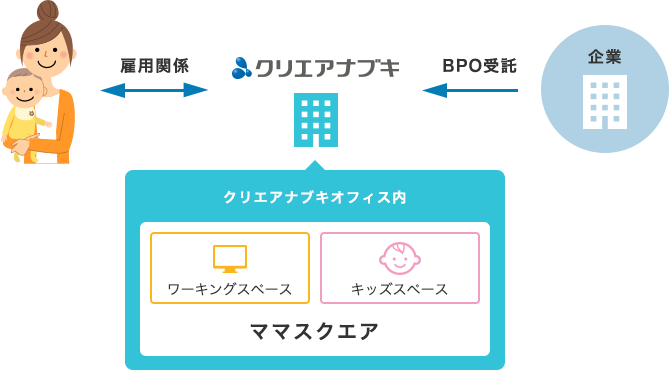 企業からクリエアナブキに依頼された業務を、クリエ×ママスクエアで行います。