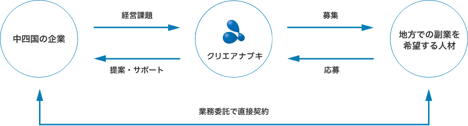 近年、都市部の優秀な人材は、「スキルアップ」「地方創生」「旅行・趣味」などを動機として地方での副業にチャレンジしたいという意欲をもっています。クリエアナブキは、副業人材サービスを通して中四国と都市部を繋ぎ、企業の経営課題解決に貢献します。